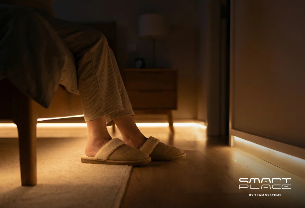 • The Experience: When an elderly person gets out of bed at night, the main lights remain off, but soft, warm, diffused lighting automatically spreads across the floor, creating a gentle path to the bathroom.